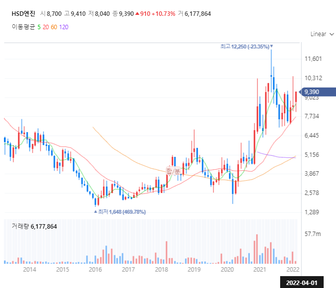 2022-2-23일 종가 9390원입니다. 이제 수익이 났네요. 그러나 한 1년 장기로 홀딩을 권합니다. 이제부터 시작일지도 모릅니다. 아래 관련 차트 사진
